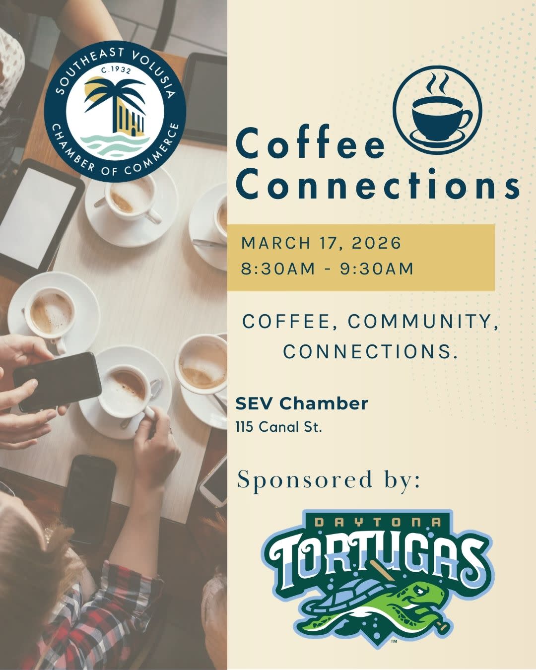 March’s Coffee Connections is hosted by Daytona Tortugas Baseball at the SEV Chamber, bringing a fresh, community-driven energy to this month’s networking experience.