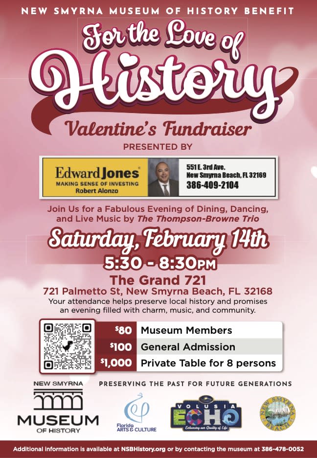 This year's auction will also feature an opportunity to win tickets to The Kentucky Derby, The Grand Canyon, and Premier Golf Experiences to some of the best courses the the world. All funds raised will go to support The Southeast Volusia Historical Society, and operation of The New Smyrna Museum of History. Visit https://nsbhistory.org/for-the-love-of-history-valentines-fundraiser/ for info and ticketing.