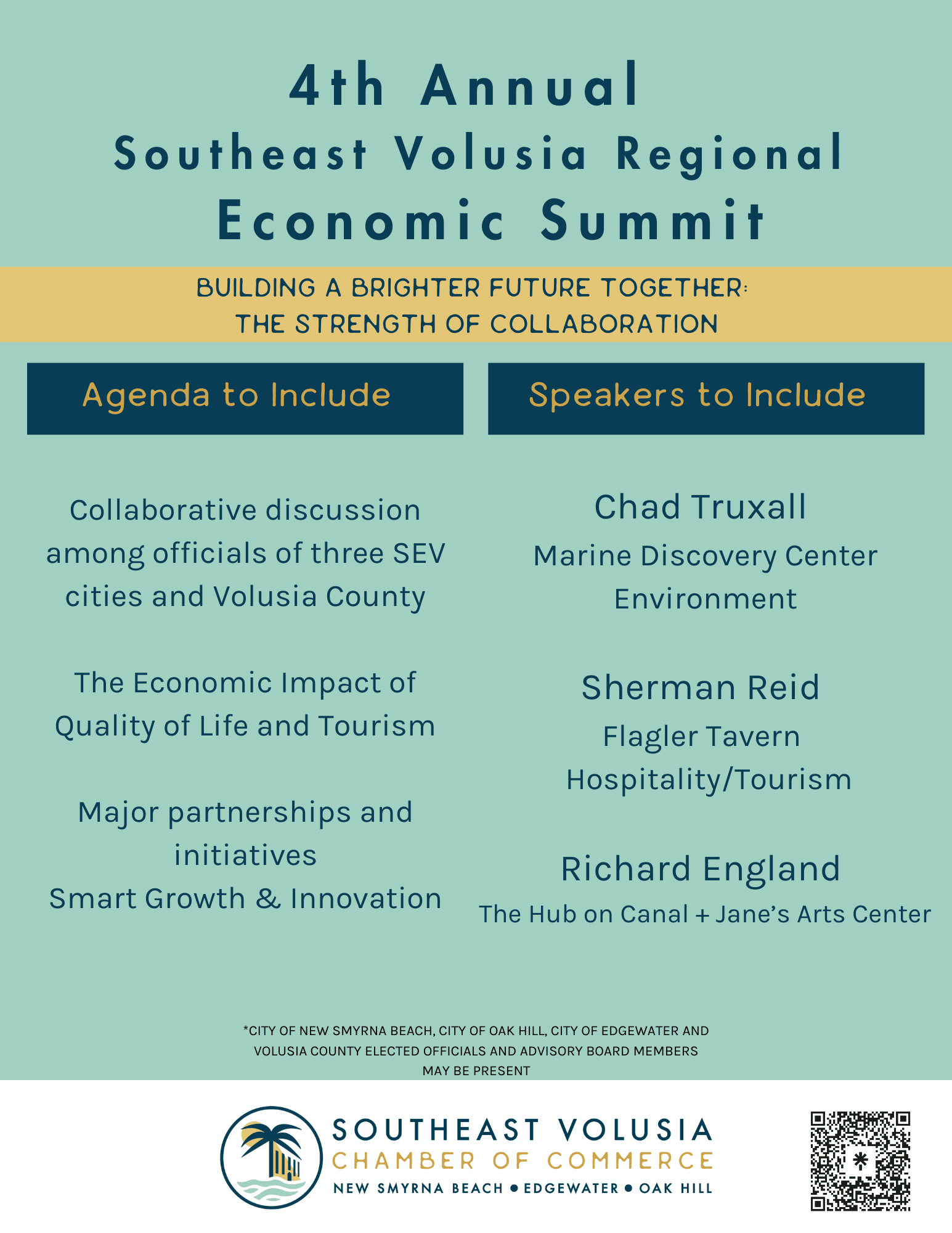 Gain valuable insights and learn from industry experts about the current economic landscape and future trends in New Smyrna Beach, Edgewater, and Oak Hill. Perfect for anyone passionate about our local economy! Connect with key players, professionals, city and county officials, and business leaders from the Southeast Volusia region. Together, we can share ideas and collaborate on projects to drive growth. Engage in an interactive discussion. Your voice matters! Let’s contribute to strategies that will define and shape the future of our community in New Smyrna Beach, Edgewater, and Oak Hill.