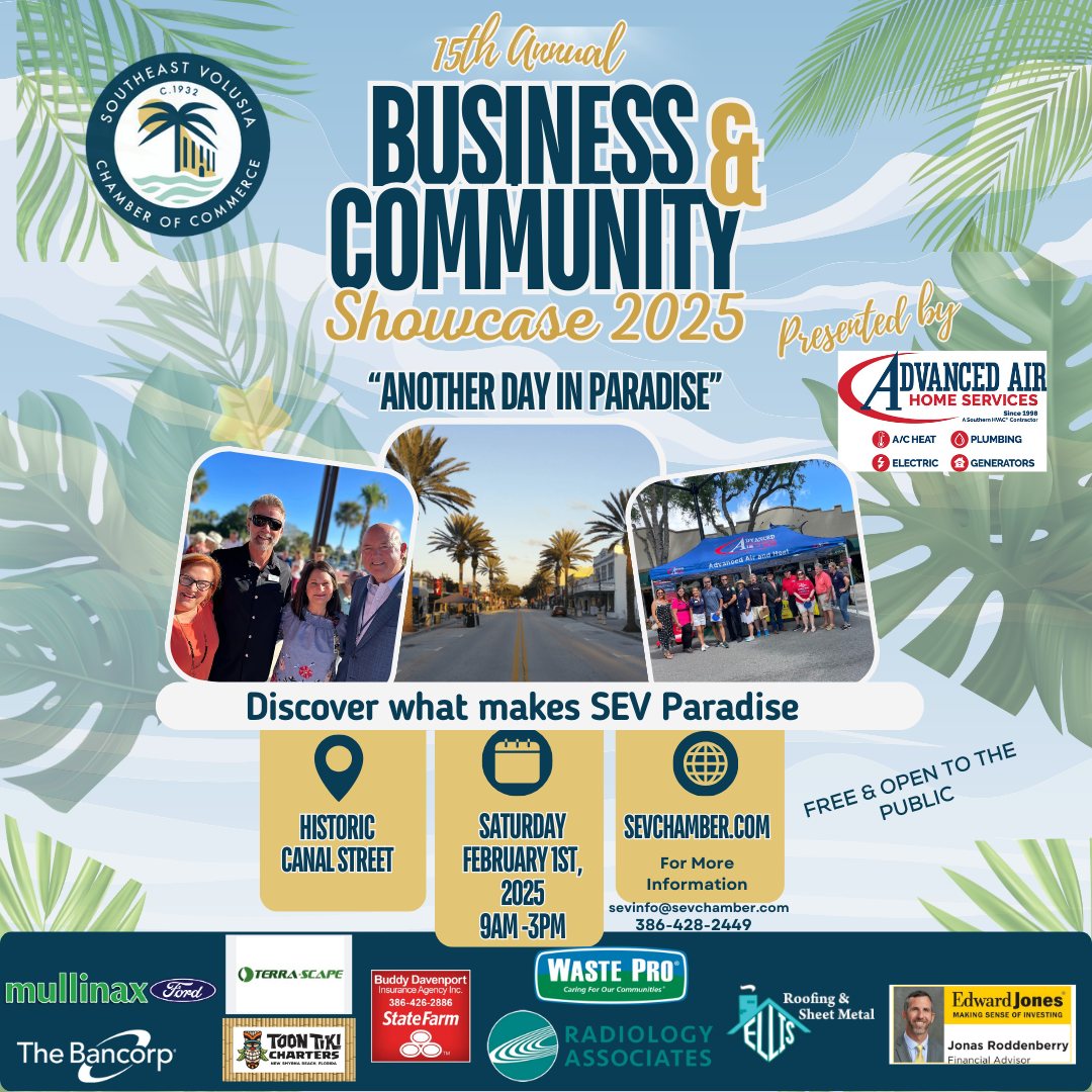 The 15th Annual Business and Community Showcase will take place on February 1st from 9:00am-3:00pm. This premier event celebrates local businesses and the vibrant spirit of our community! This year's showcase will be "Another Day in Paradise" and will feature over 100 vendors, offering a one-stop shop for all your business and personal needs. This event is more than just a business expo- it's a chance to build relationships, share ideas, and learn about community development! Show what Paradise means to you in Southeast Volusia! Don't miss out on the chance to showcase your business to a diverse audience. Register today for a vendor booth space and be part of this exciting event. Maximize your exposure as a sponsor! Have your logo prominently displayed throughout the event and featured in our marketing and social media posts. This is a fantastic way to enhance your visibility and support the local community. Register now to secure your spot as a vendor or sponsor and join us in celebrating our incredible community! This is a non-refundable event as this is a Chamber Fundraiser.