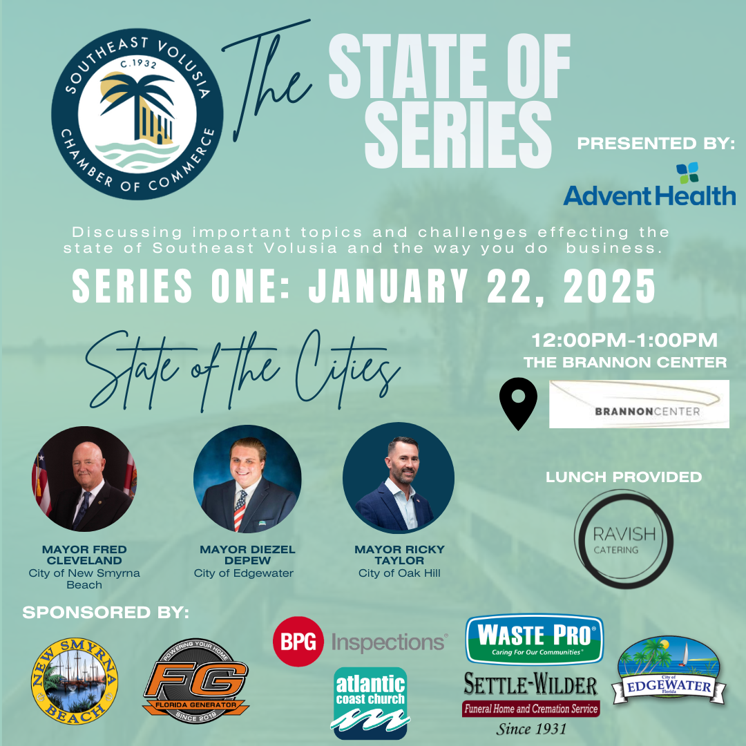 Join us for The State of the Cities, part of our impactful State of Series. This event will bring together community leaders and stakeholders from New Smyrna Beach, Edgewater, and Oak Hill to discuss the important topics and challenges shaping the future of Southeast Volusia.